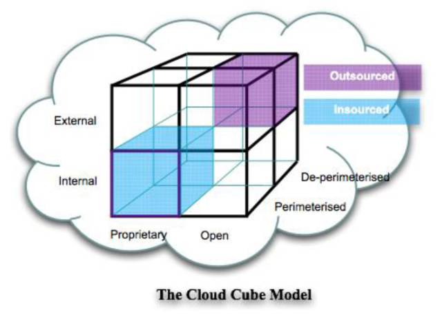 云立方体模型从安全系统的角度,在数据的物理位置、云相关技术和服务的所有关系状态、应用资源和服务时的边界状态、云服务的运行和管理者4个影响安全系统的维度上分成了16种可能的云计算形态,如下图所示: